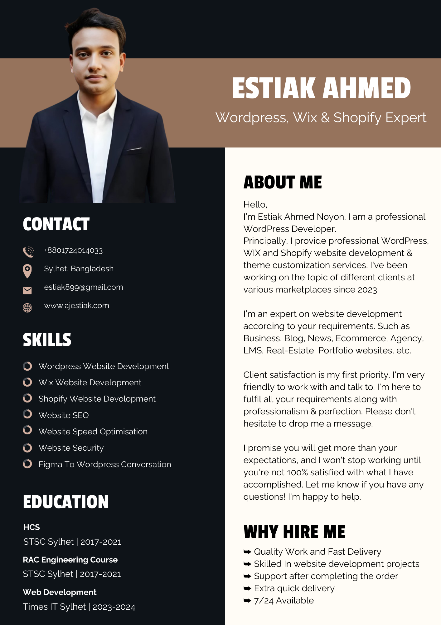 Hi, I’m Aj Estiak, a skilled WordPress Developer. I specialize in creating professional websites using WordPress, Wix, and Shopify, including theme customization and development. Since 2023, I’ve worked with a wide range of clients across different online marketplaces. I offer custom website development tailored to your needs — whether it’s a Business, Blog, News, E-commerce, Agency, LMS, Real Estate, or Portfolio website, and more.